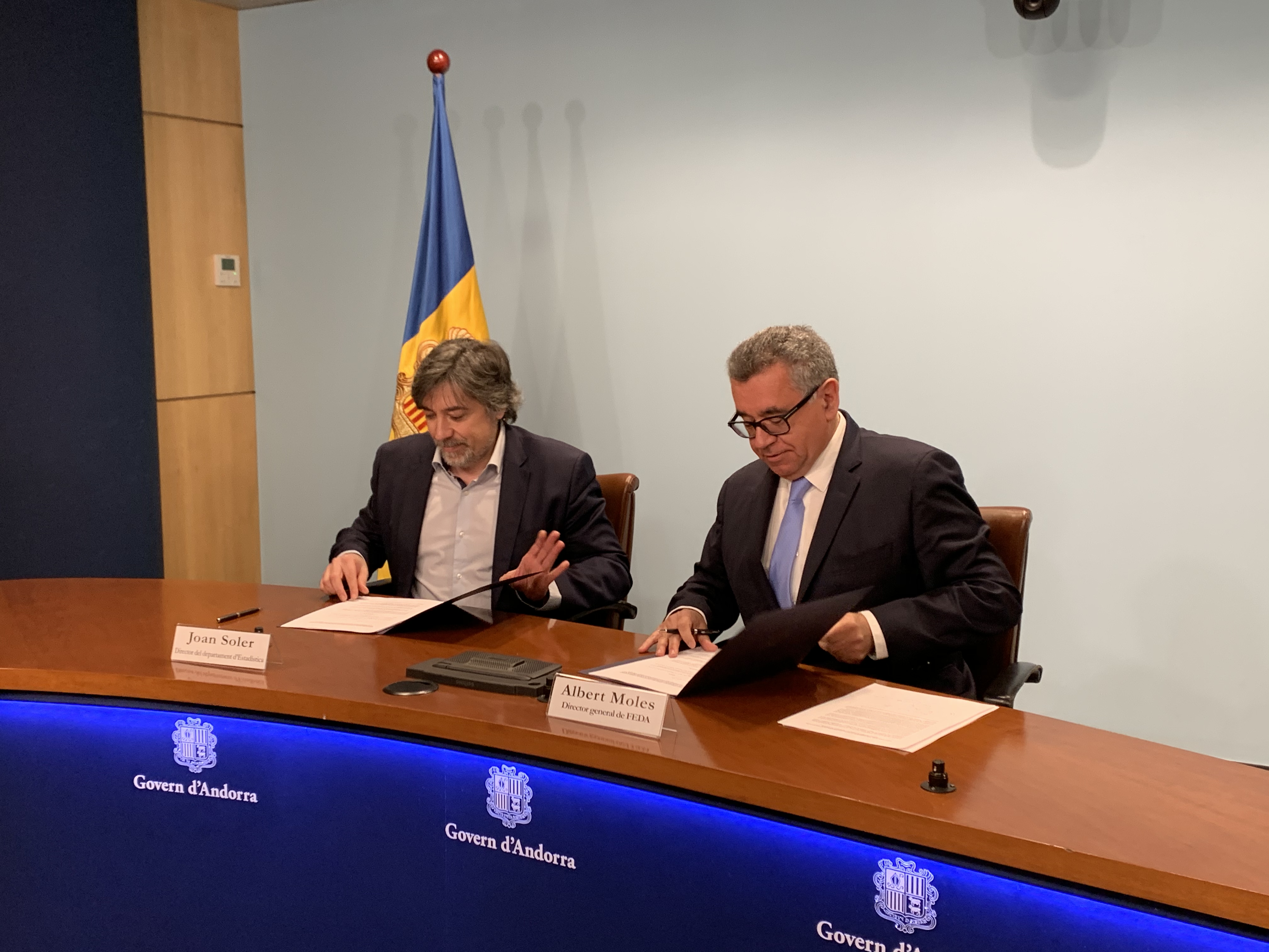 27.02.2020. El director del Departament d’Estadística, Joan Soler, i el director general de Forces Elèctriques d’Andorra (FEDA), Albert Moles, han signat un conveni per a la cessió de dades que permetrà elaborar el registre estadístic de població i l’estadística d’edificis i unitats domiciliàries, ambdós projectes inclosos en el pla estadístic 2018-2021.
