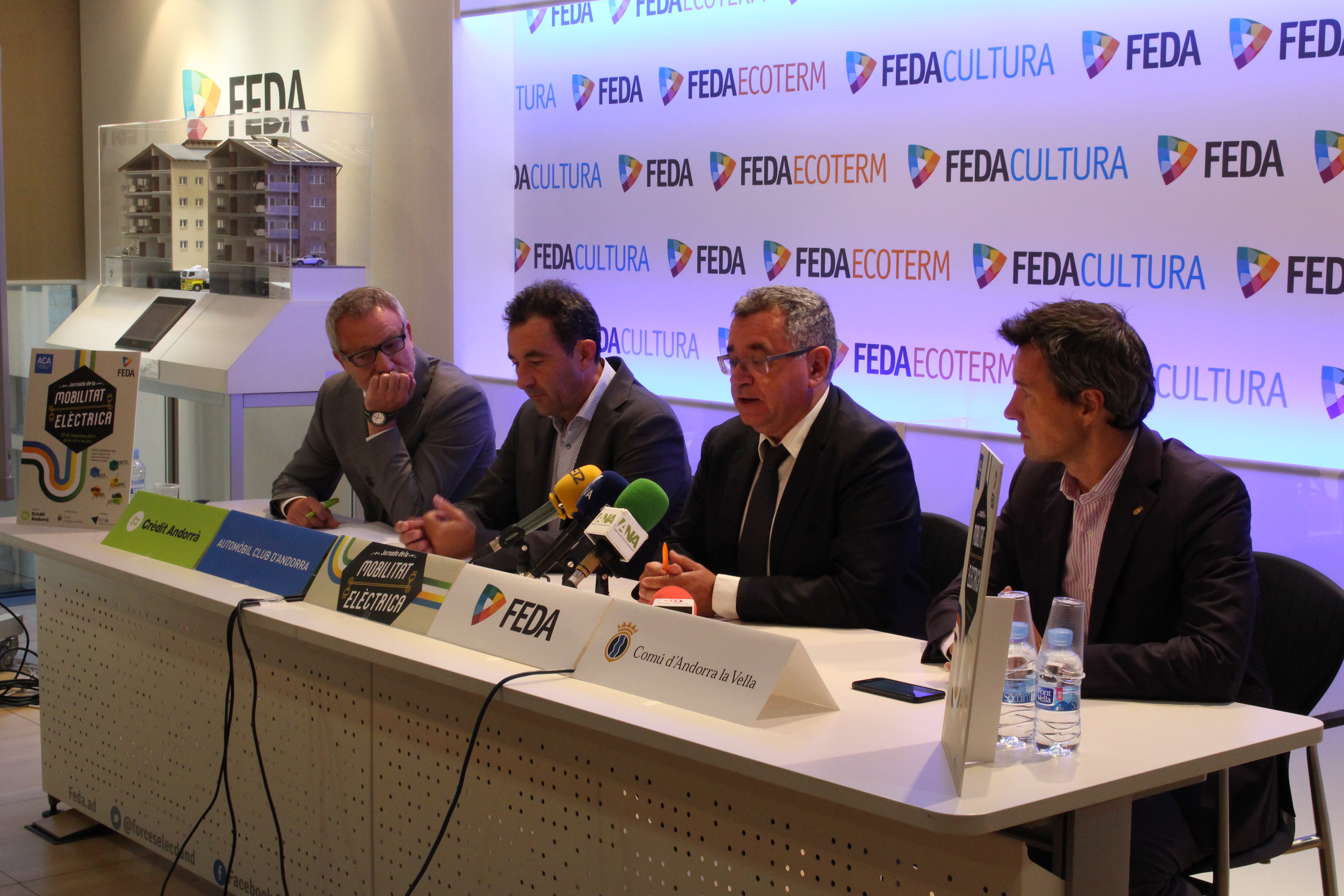 El director general de FEDA, Albert Moles, i el secretari general de l’Automòbil Club d’Andorra, Antoni Sasplugas, han presentat avui la Jornada de la Mobilitat Elèctrica 2017 (JME17), que se celebrarà el pròxim dissabte 23 de setembre a la Plaça de la Rotonda d’Andorra la Vella. En la presentació, també hi han assistit el director de màrqueting de Crèdit Andorrà, Joan Ramon Mas -patrocinador oficial per segon any consecutiu de la Jornada-, i el conseller de medi ambient i innovació del Comú d’Andorra la Vella.