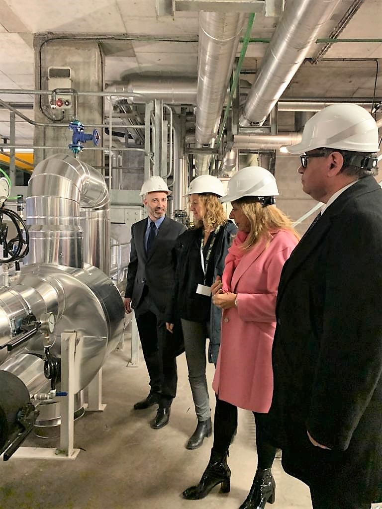 La ministra de Medi Ambient, Agricultura i Sostenibilitat i presidenta de FEDA, Sílvia Calvó, la cònsol major d’Andorra la Vella, Conxita Marsol, el director general de FEDA, Albert Moles, i el gerent de FEDA Ecoterm, Jordi Travé, han visitat les instal·lacions del Centre de Tractament de Residus, d’on parteix la xarxa, i el centre esportiu, que és el primer edifici en connectar-s’hi.